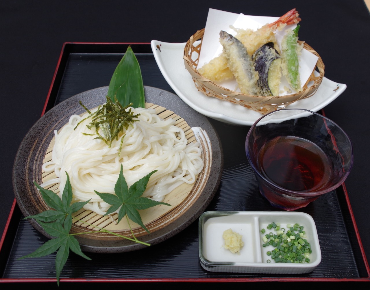 Boiled udon cooled in cold water and served on a bamboo tray.