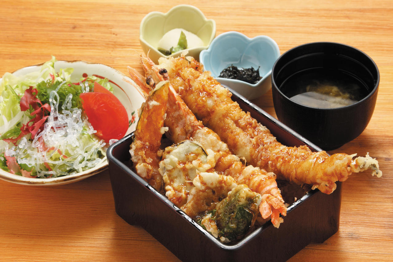 Thinly sliced fish, seafood, and vegetable tempura served over rice.