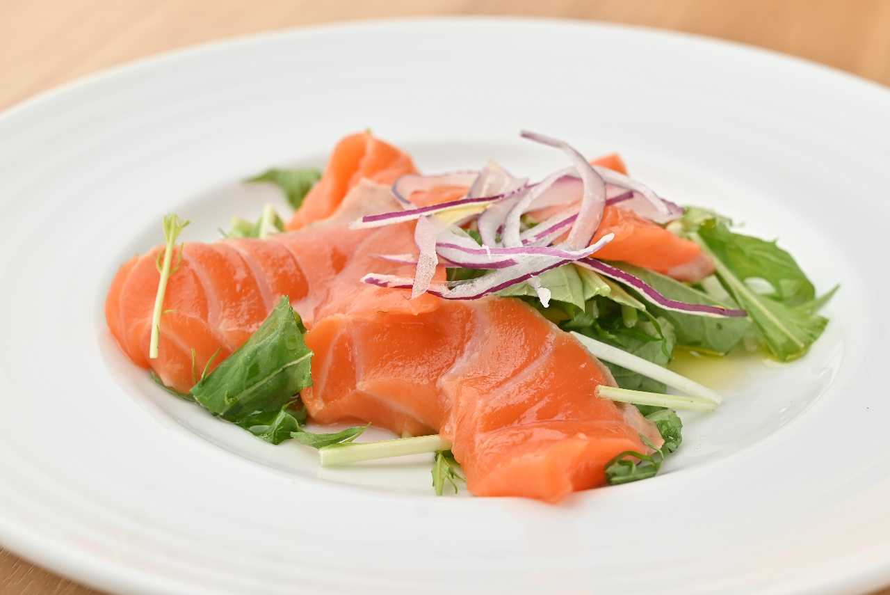 Thinly-sliced fish seasoned with olive oil, salt and pepper.