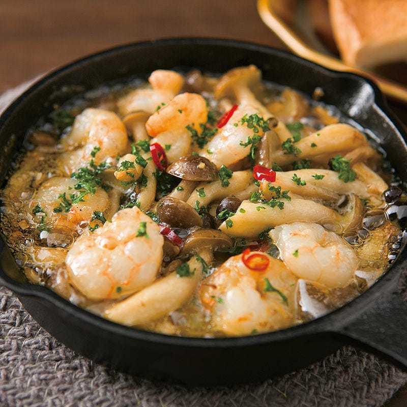 ぶりぶり海老とキノコの熱々鉄板アヒージョ