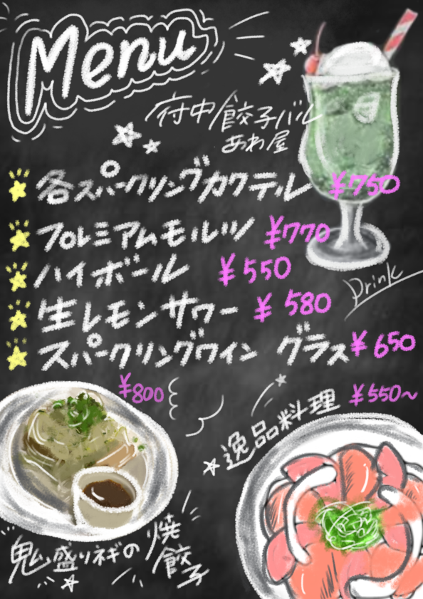 | Menu | All you can drink menu, Bring in your own drink OK |