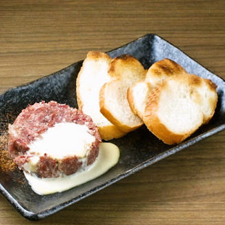 Fresh, finely minced horse meat mixed with various spices and seasonings, topped with a fresh egg yolk.