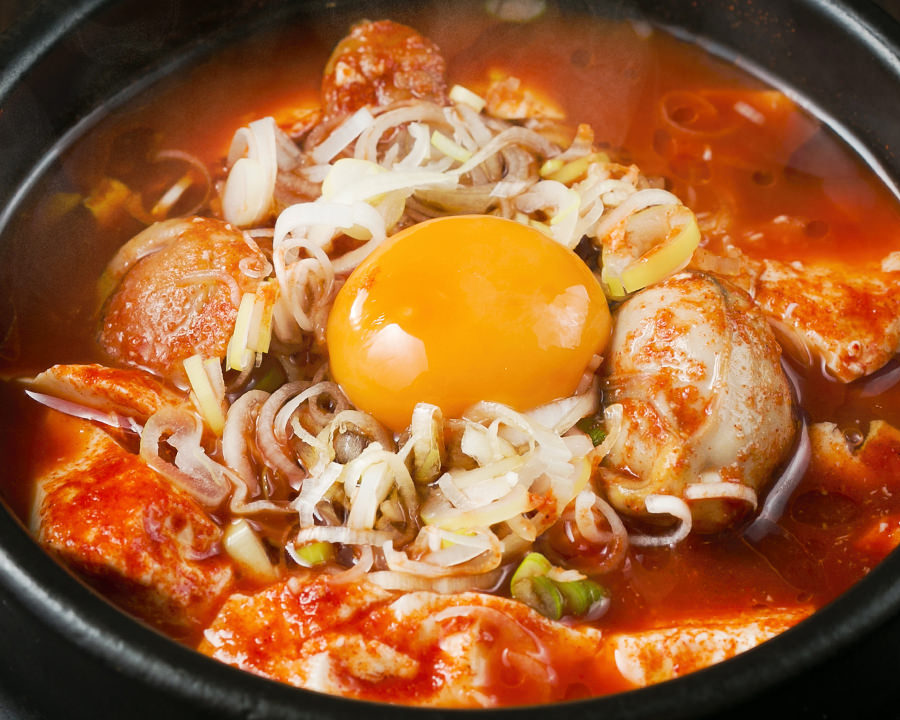 Kimchi, meat, seafood and other food ingredients cooked in a broth, served in a pot.