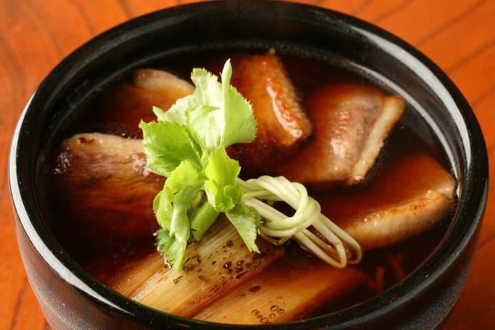 A dish of hot buckwheat noodles in a duck and green onion soup.