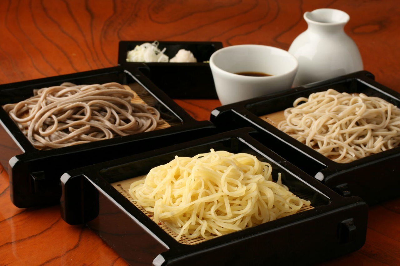 Buckwheat noodles served on a bamboo strainer