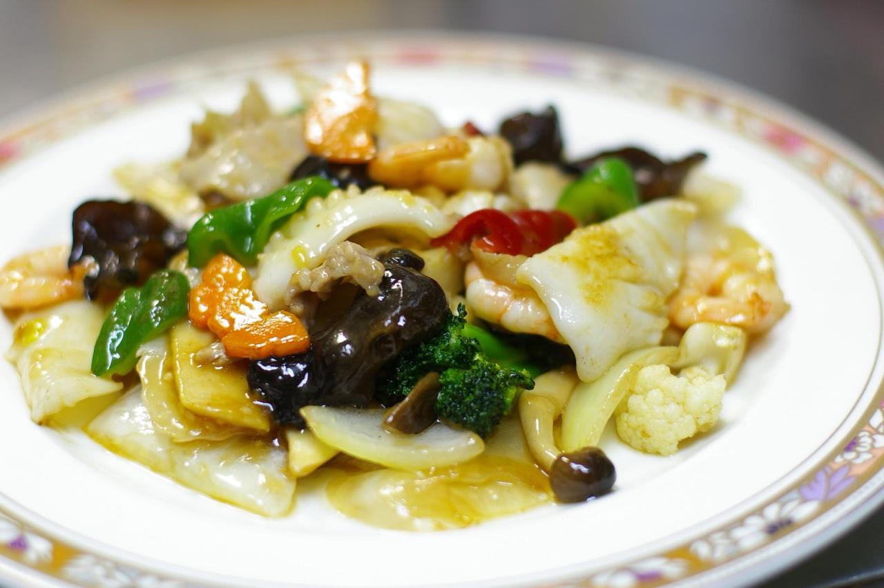 Shrimp and other ingredients stir fried with XO sauce.