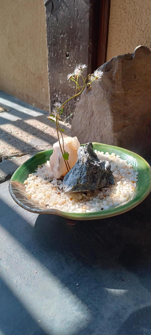 Zen rock garden bonsai and dandelion fluff