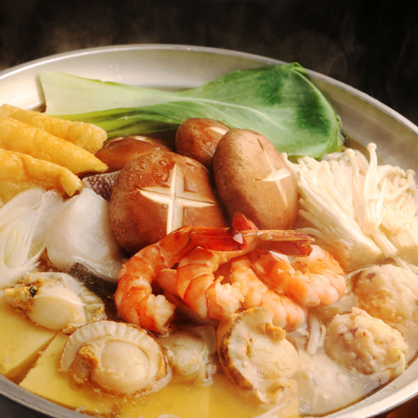 Chicken, Chinese cabbage, Japanese leek, Shiitake, Konjac noodles, Tofu, Thin slice deep-fried tofu, Enoki mushroom, Shrimp, Scallop