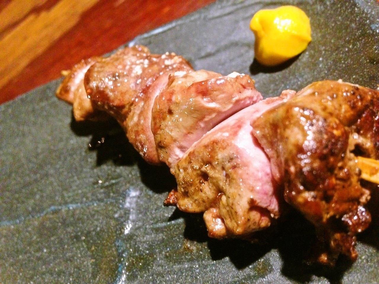 A dish of spit-roasted seasoned chicken neck meat on a skewer.