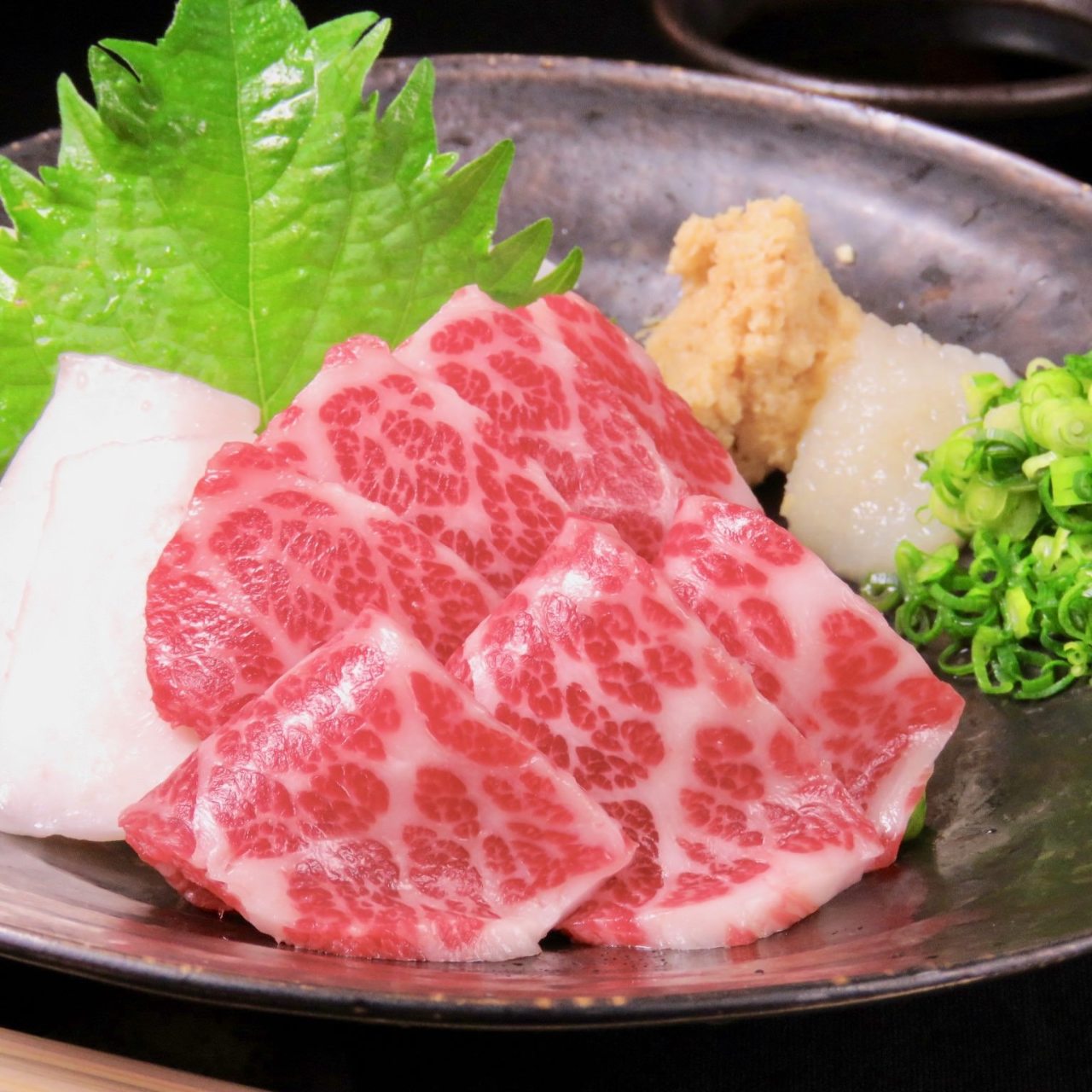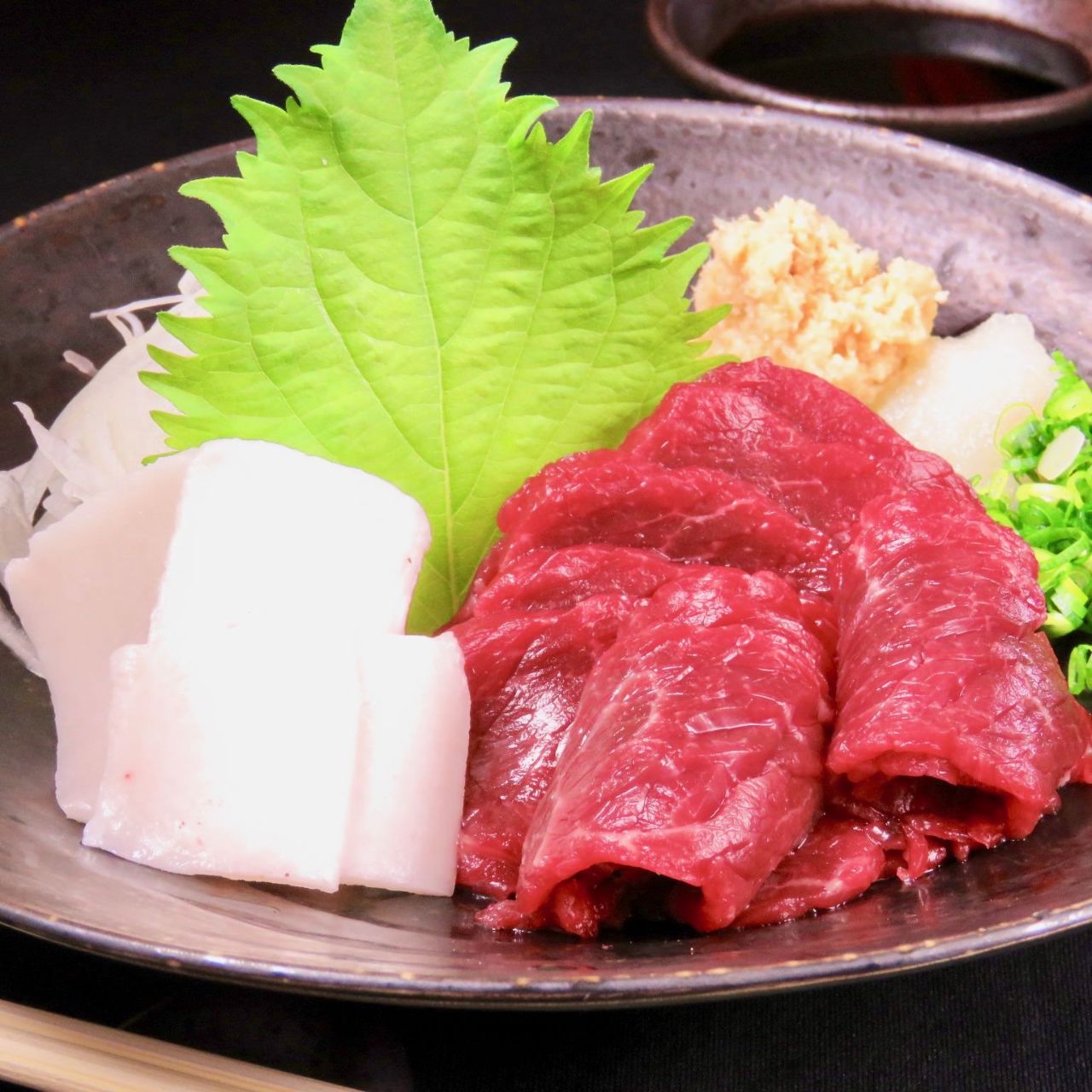 Toro (meat from around a horse's flank), thinly sliced and eaten with soy sauce and other condiments.