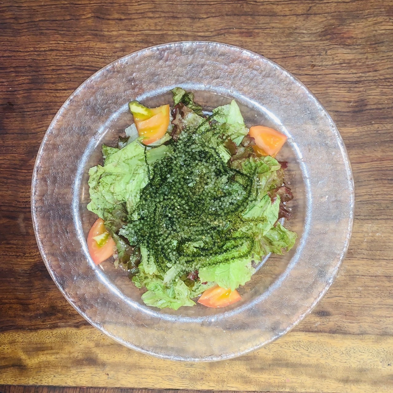 A salad dish prepared using an Okinawan seaweed called "sea grapes."