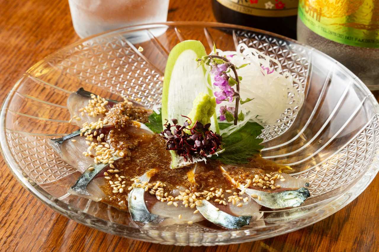 Fresh, sliced mackerel seasoned with sesame, soy sauce, and mirin, etc., a regional dish of Fukuoka prefecture.