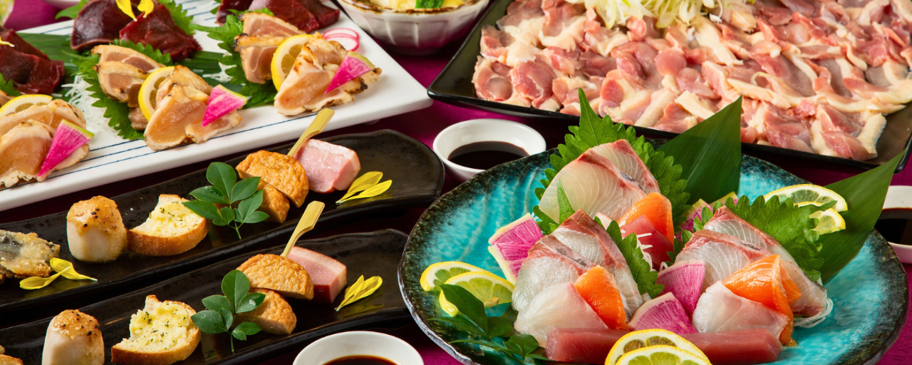 We offer a variety of courses using carefully-selected ingredients from the local Miyazaki in Kyushu with all-you-can-drink privileges.