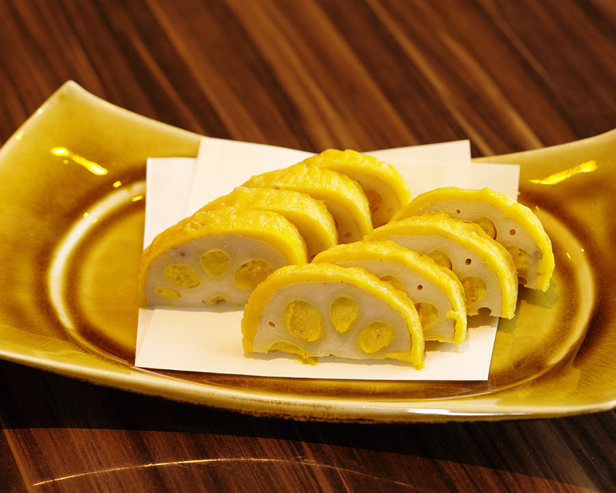 A regional dish of Kumamoto prefecture prepared from lotus root filled with miso paste mixed with Japanese mustard, deep-fried in oil, then sliced into rings.