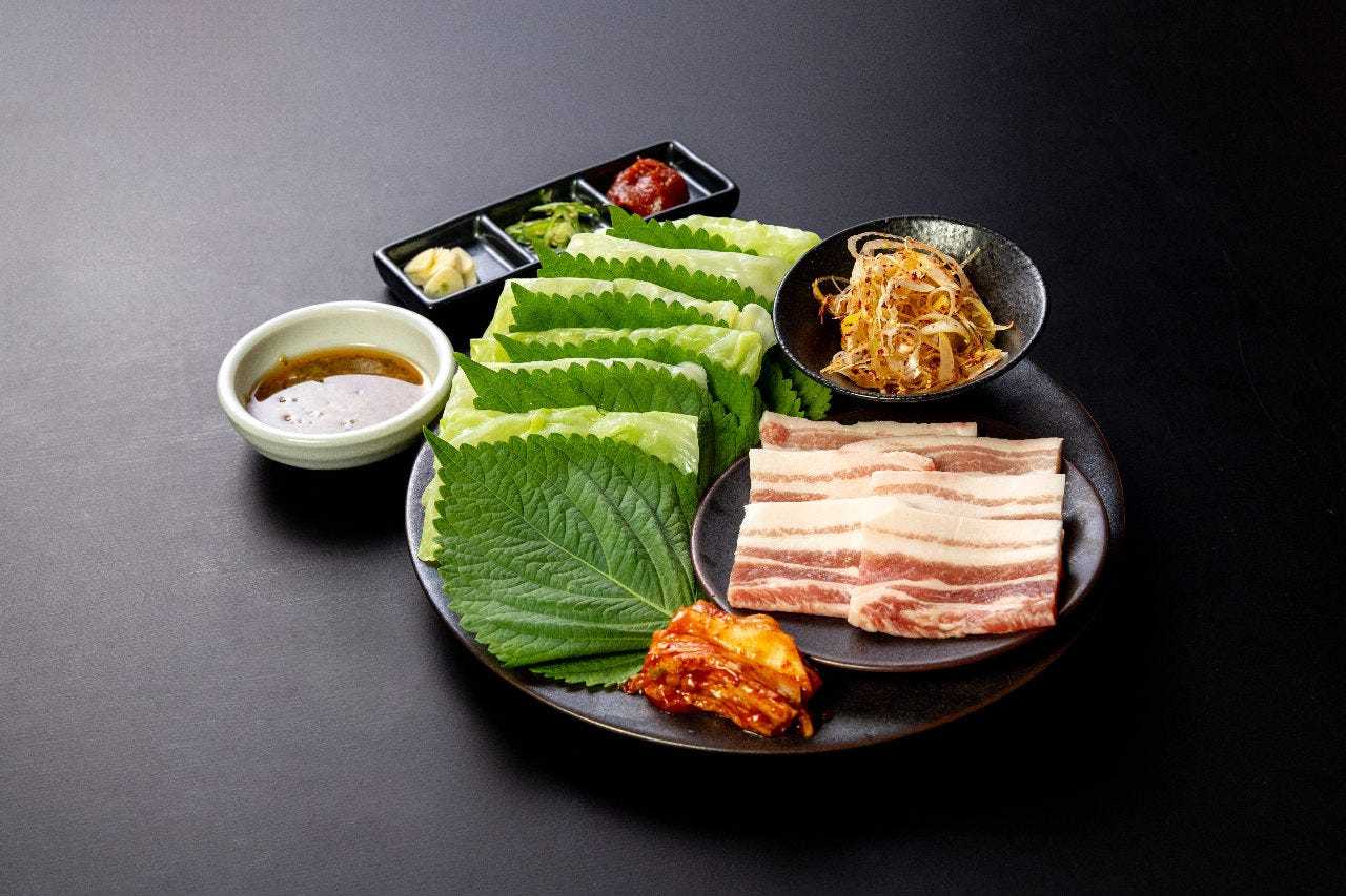 Thickly-sliced pork belly roasted on a hot plate and enjoyed with leafy greens and seasonings.