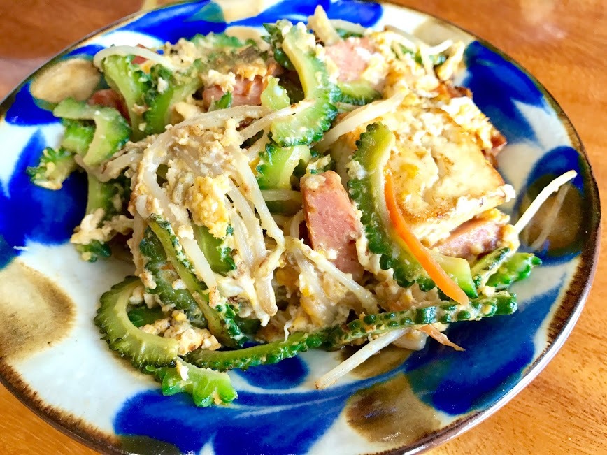 An Okinawan dish consisting of tofu stir-fried with vegetables, meat, etc.