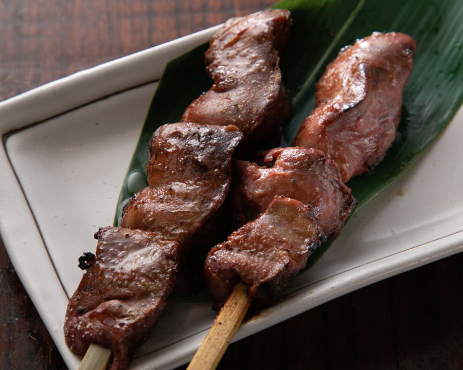 A dish of bite-sized pork cheek called "Kashira" skewered and grilled over an open flame.