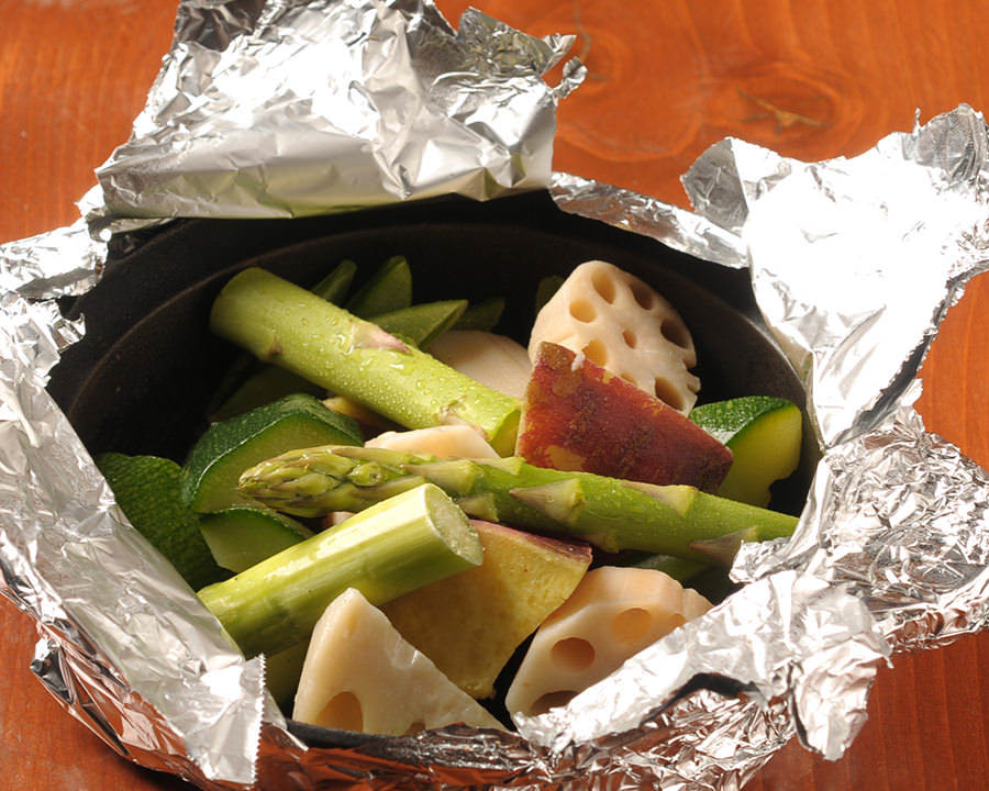 Sweet potato, Lotus root, Asparagus, Brown beech mushroom, Taro, Hen-of-the-woods, Dried bonito