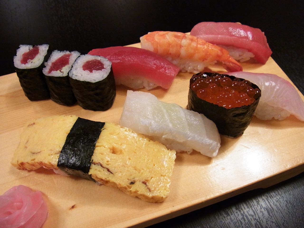 Vinegared rice, Tuna, White flesh fish, Shrimp, Hen's egg, Ginger