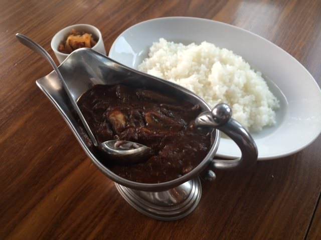 Thinly-sliced meat and onions, simmered together in a demi-glace sauce and served over rice.