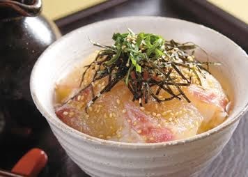 Rice topped with fresh sliced sea bream and seasonings, with broth or Japanese tea poured over.