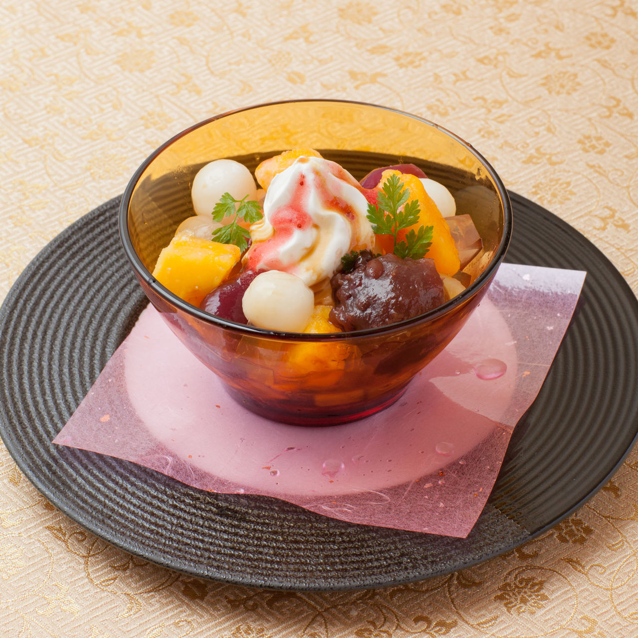 Anmitsu (agar gelatin with fruits, sweetened red beans and sweet red bean paste)