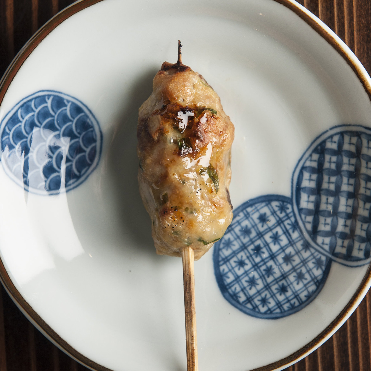 A dish of spit-roasted kashiwa (chicken) on a skewer.