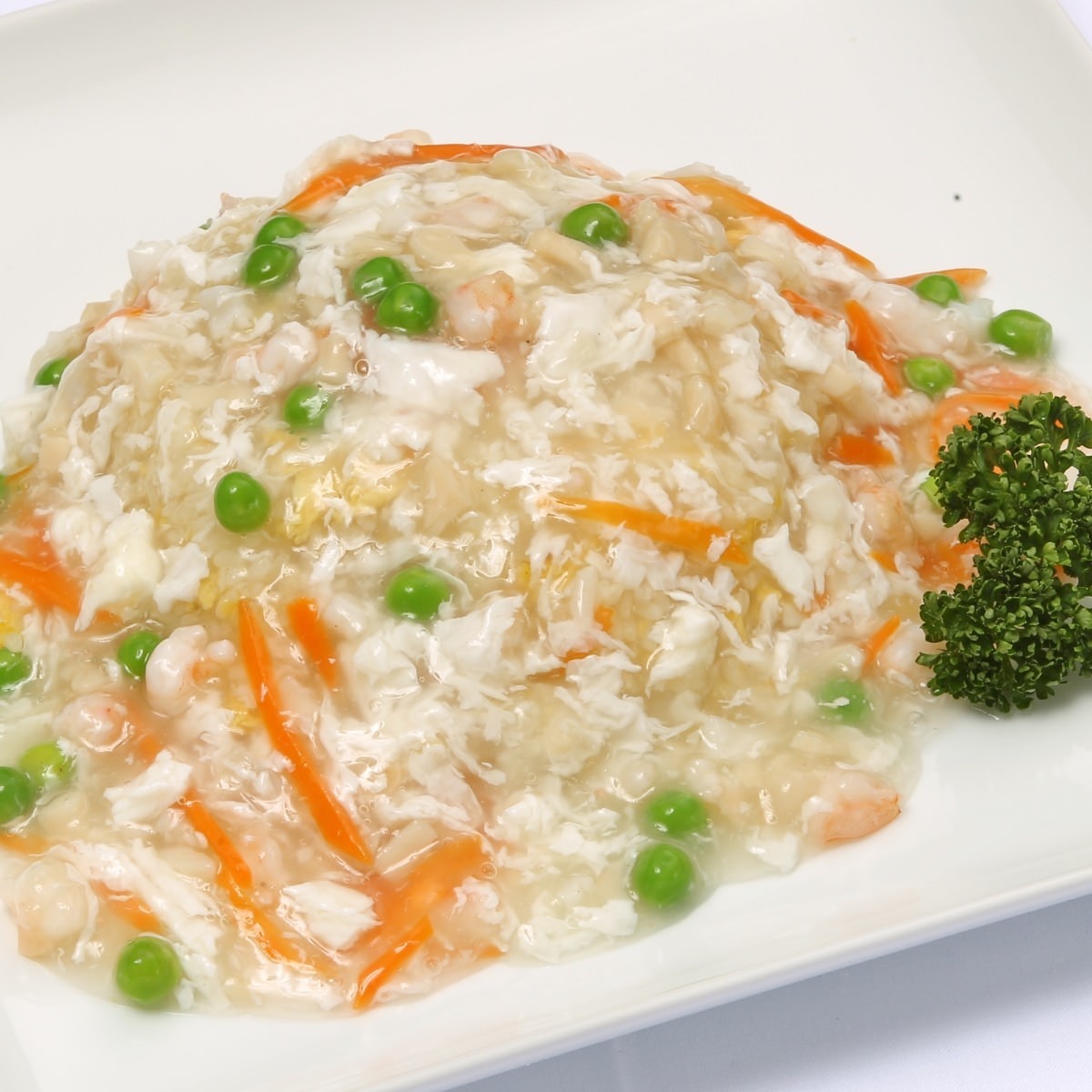 Meat, seafood and vegetables stir-fried and seasoned with salt and soy sauce, etc., then lightly cooked in chicken bone broth and thinned potato starch, etc.