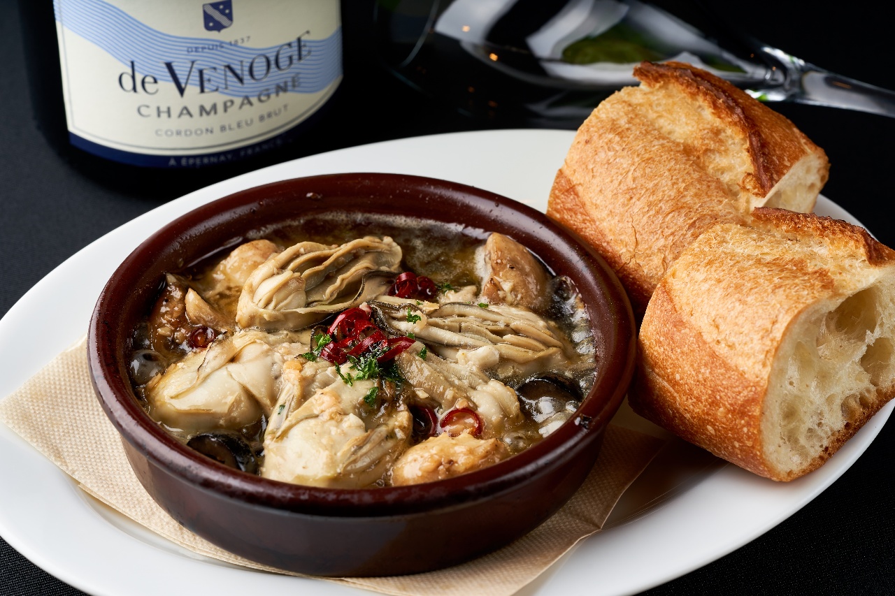 A Spanish dish of oysters and mushrooms simmered with garlic and olive oil, etc.