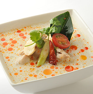Chicken and other ingredients stewed in a soup made with coconut milk and herbs such as lemongrass.