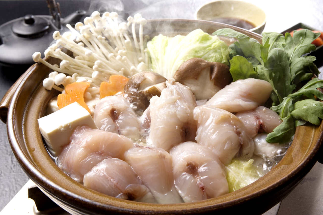Japanese pufferfish, Garland chrysanthemum, Scallion/Green onion/Leek, Chinese cabbage, Enoki mushroom, Tofu