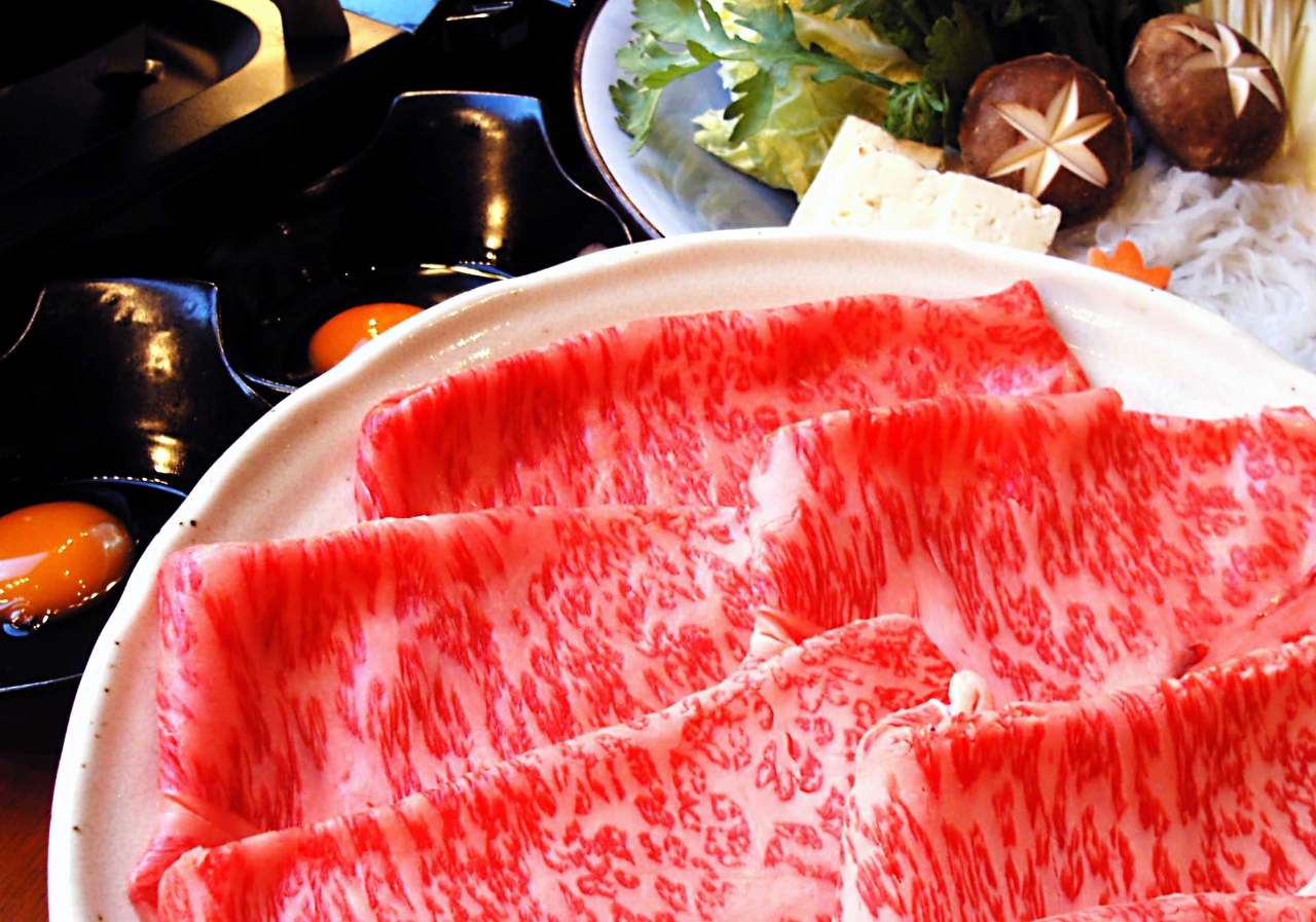 Wagyu beef, Garland chrysanthemum, Japanese leek, Shiitake, Hen's egg, Konjac noodles, Tofu
