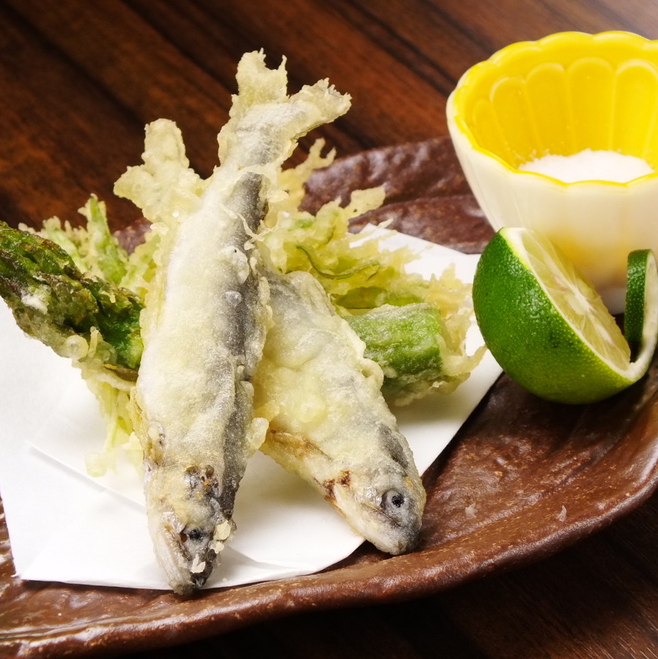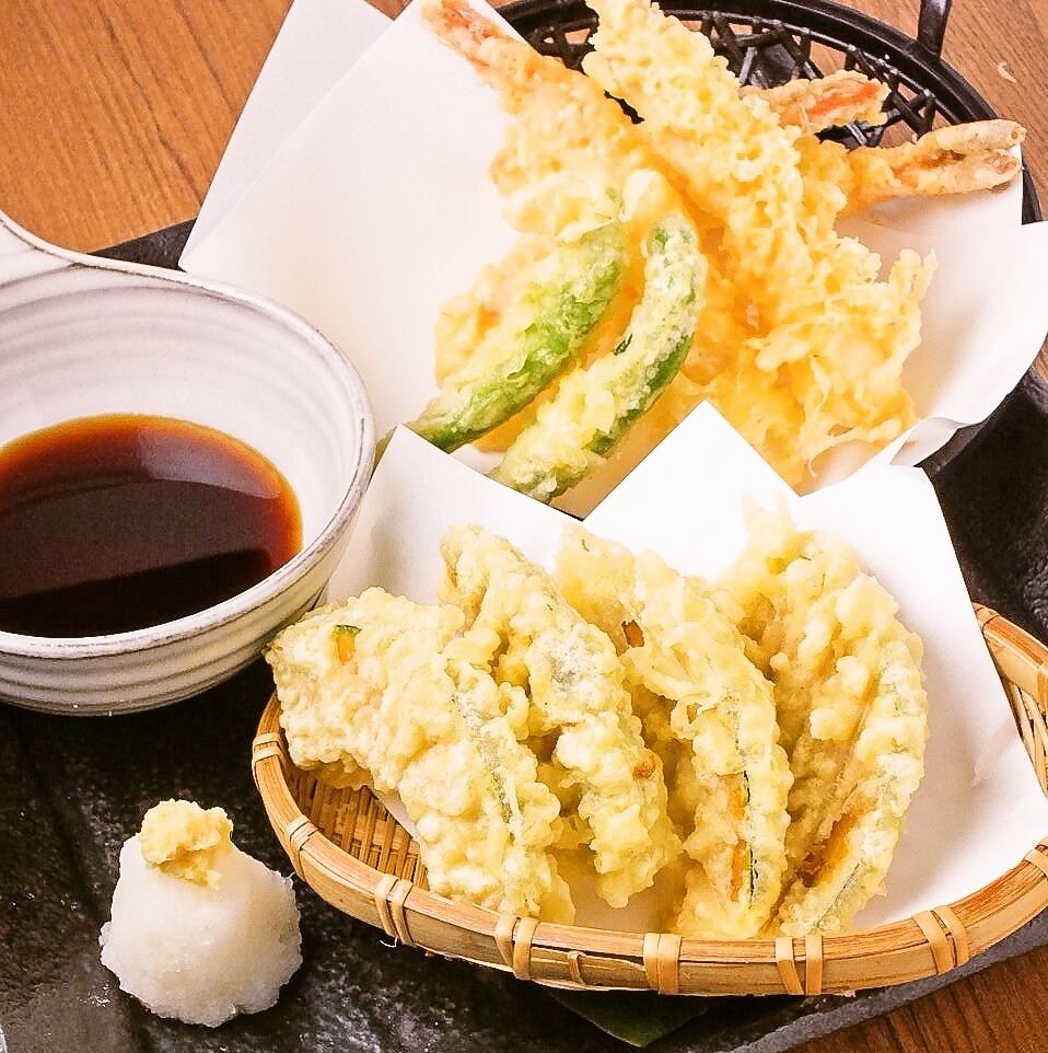 Seafood, vegetables or other ingredients coated in a soft wheat flour batter and deep-fried.