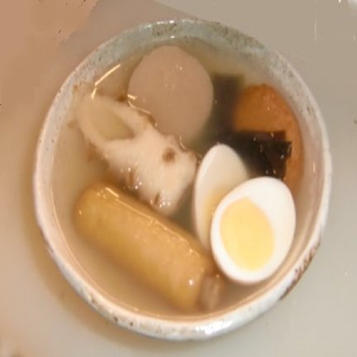 Hen's egg, Daikon radish, Salted seaweed, Tube-shaped fish paste cake, Konjac, Fish paste, Deep-fried fish cake