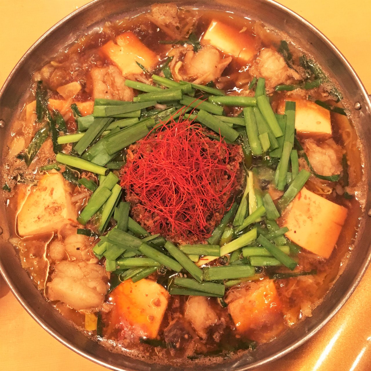 A hotpot dish in which beef and pork offal known as motsu, coriander, vegetables, and other ingredients are boiled together in a spicy broth.