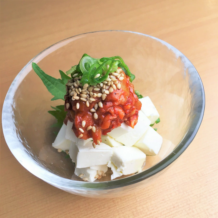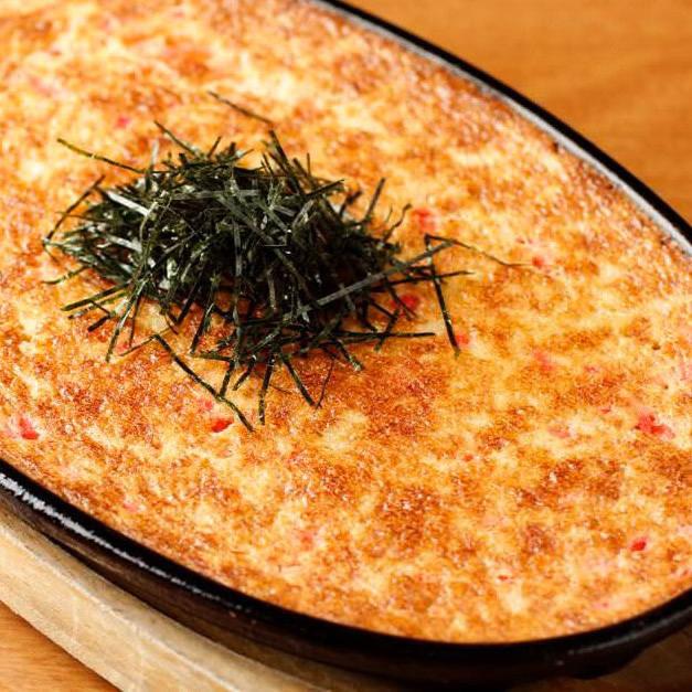 Thinly sliced deep-fried tofu, topped with a marinated cod roe and cheese, then baked.