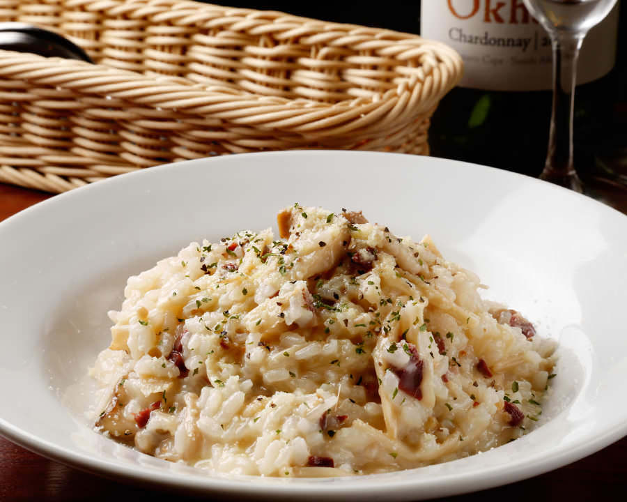 Rice fried in butter and cooked in wine and broth, and then mixed with cheese.