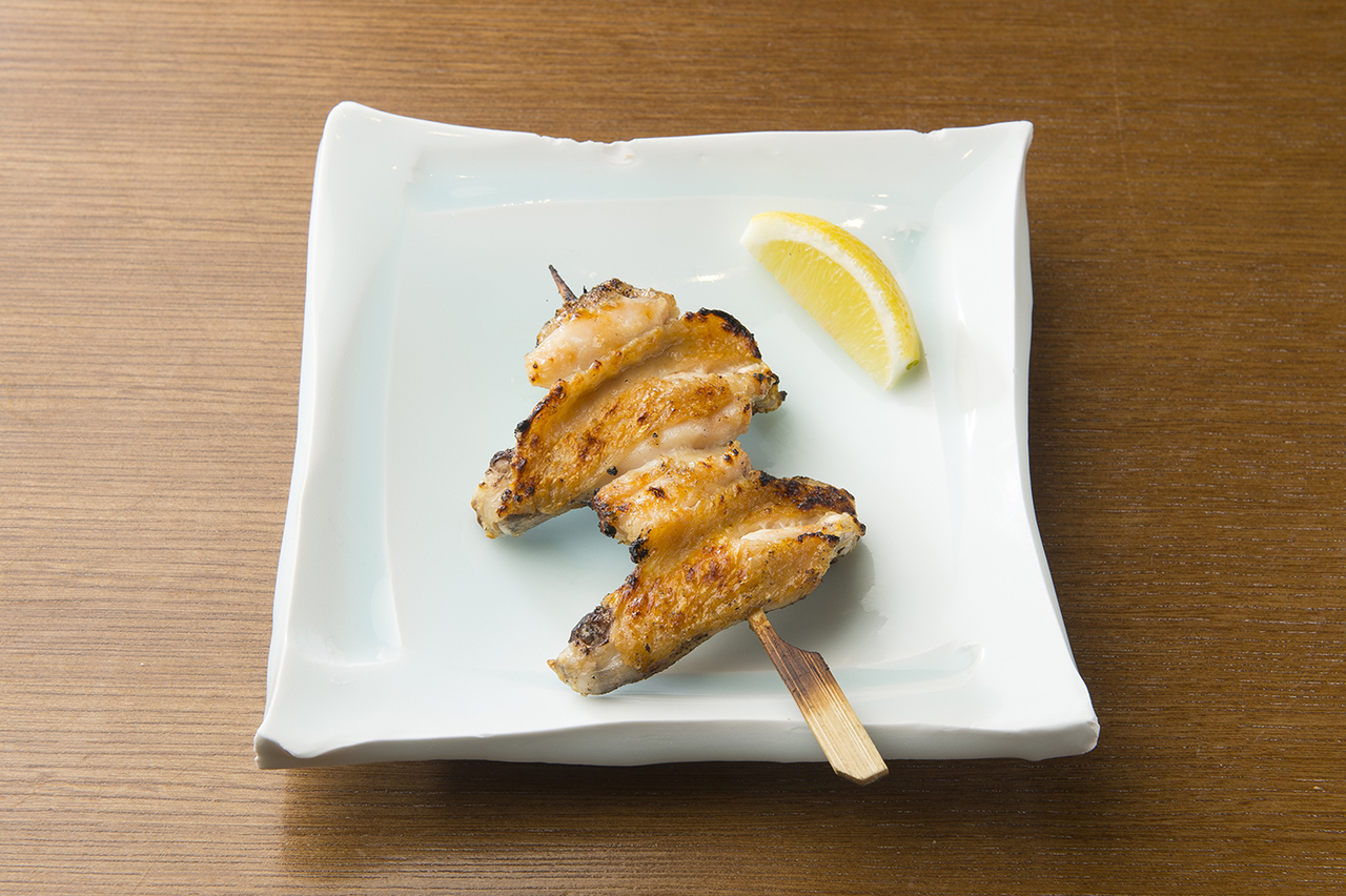 A dish of grilled chicken cartilage which is at the tip of chicken breastbone on a skewer.