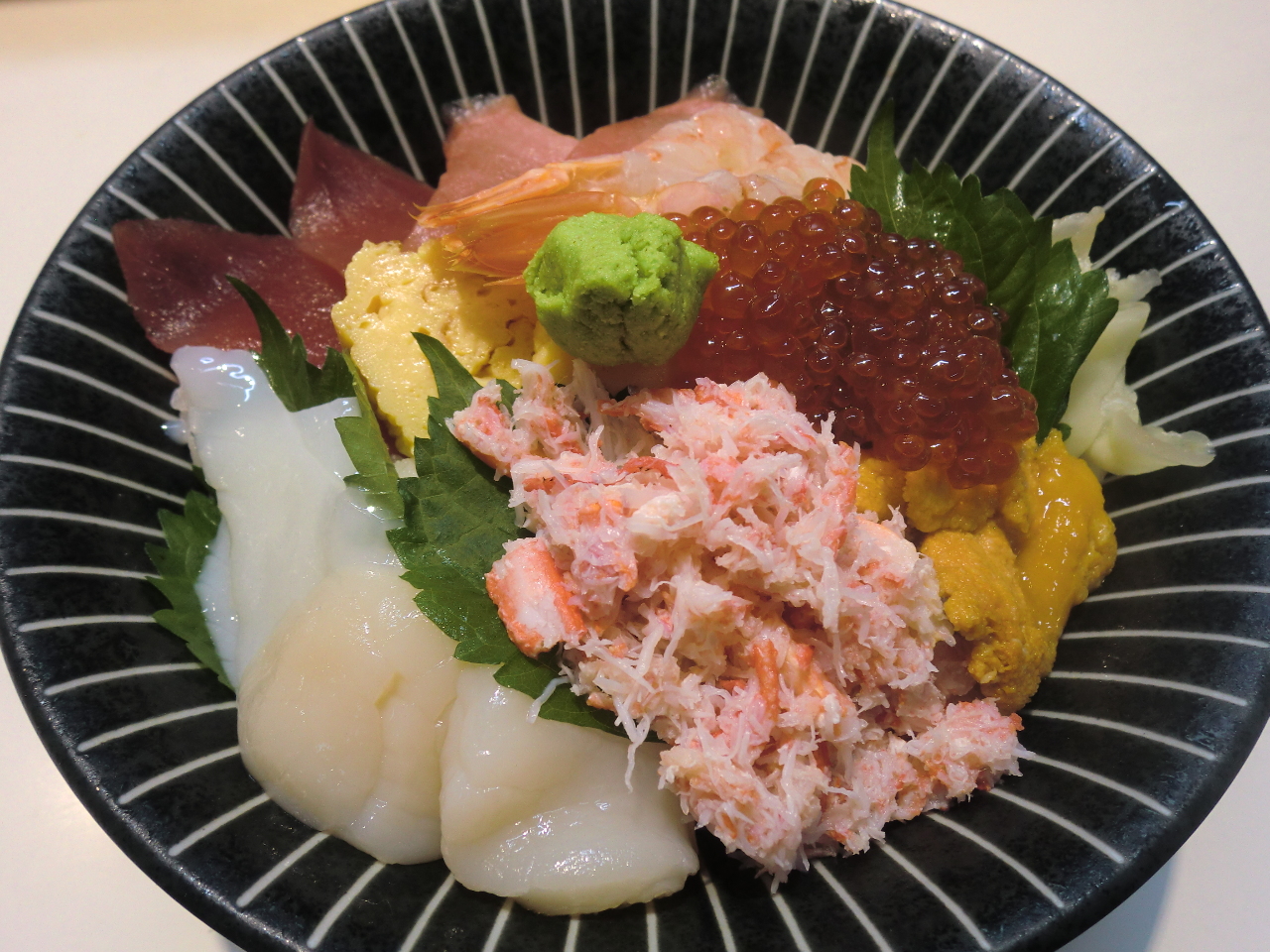 Snow crab, salmon roe, and high quality sea urchin served over a bowl of rice.