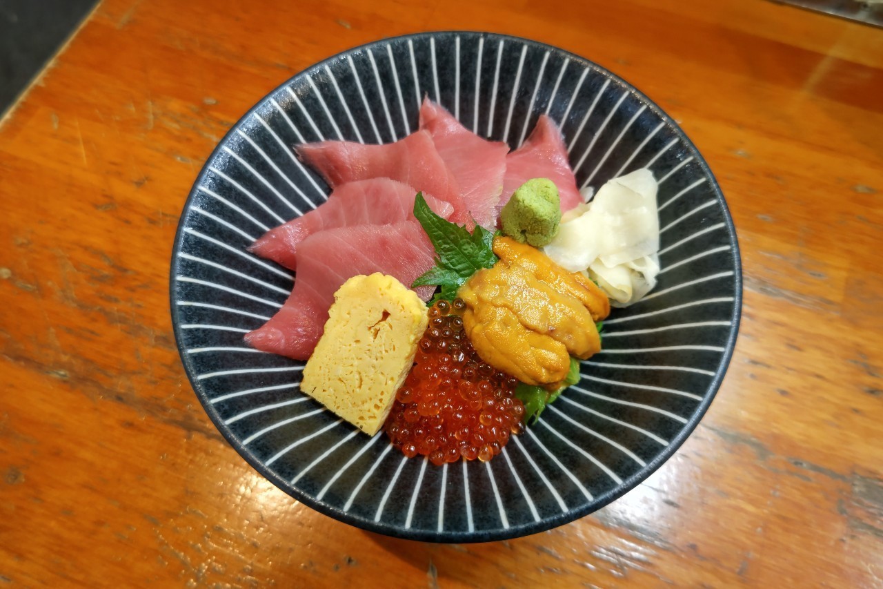 Medium fatty tuna, salmon roe, sea urchin and Japanese omelette served over a bowl of rice.