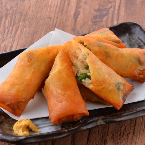 Ground meat and vegetables ,etc. seasoned with soy sauce etc. and then wrapped in a thin dough and deep-fried.