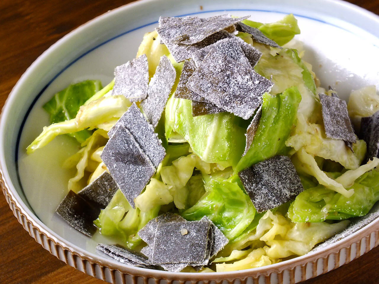 A dish made up of raw cabbage which has been roughly cut into bite-sized chunks.