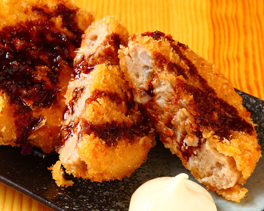 Cake of minced pork or beef kneaded together with onion, coated in batter and deep-fried.