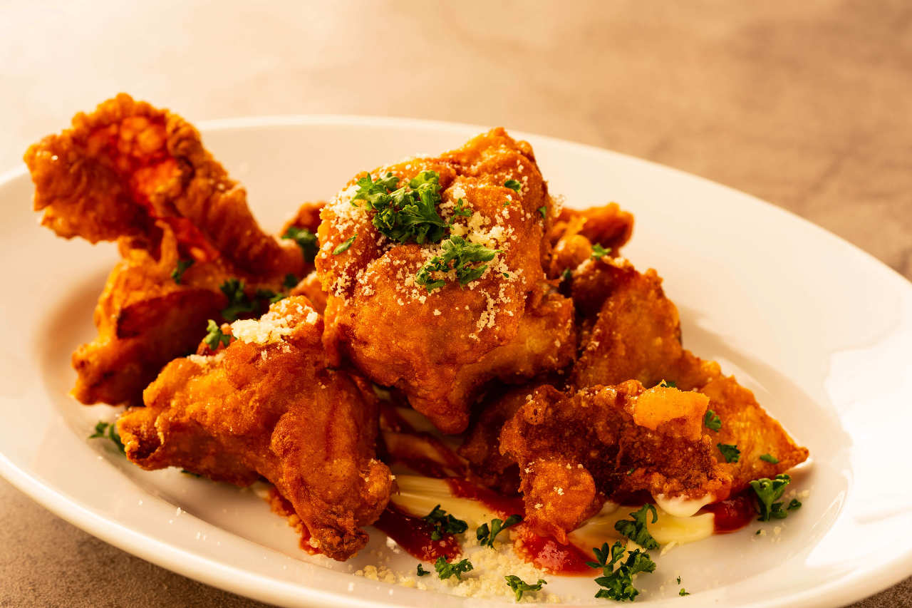Chicken lightly battered and deep-fried.