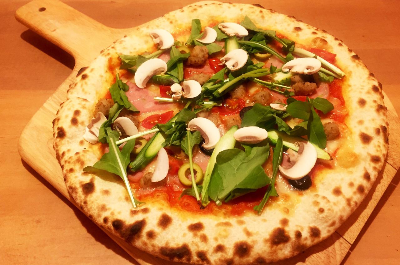 Cheese, Ham, Salsiccia, Asparagus, Cherry tomato, Olive, Arugula, Mushroom, Wheat flour, Hen's egg
