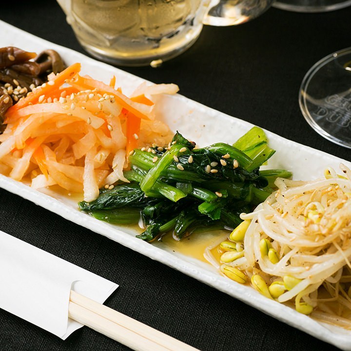 Platter of vegetables, such as bean sprouts, boiled and seasoned with sesame oil and salt.
