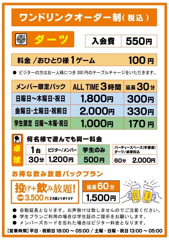 Monday - Friday & Day before holiday 15:00 - 5:00, the following day(L.O.4:30, Drink L.O. 4:30)