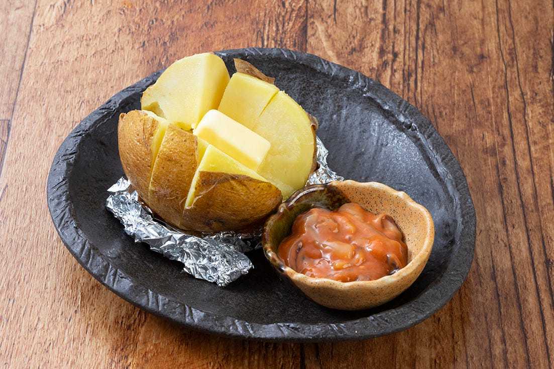Steamed potato topped with salted squid entrails and butter.