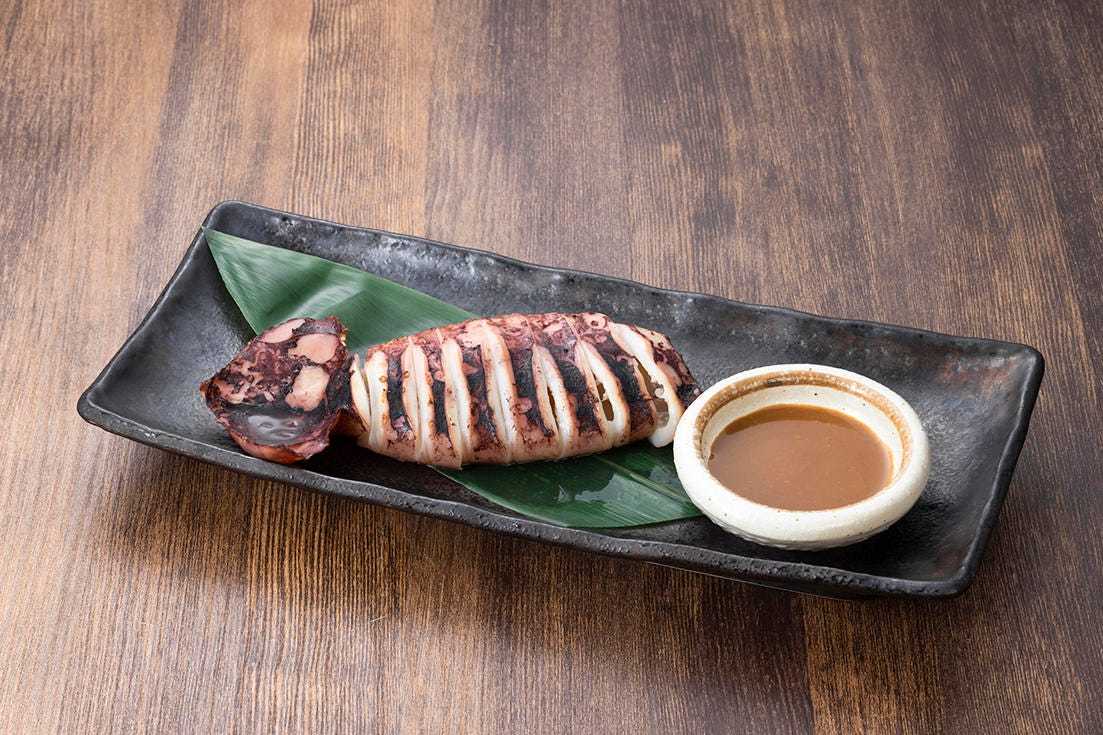A dish of squid mantle stuffed with squid tentacles and entrails flavored with soy sauce, miso, and salt, along with minced green onions, etc., then grilled.