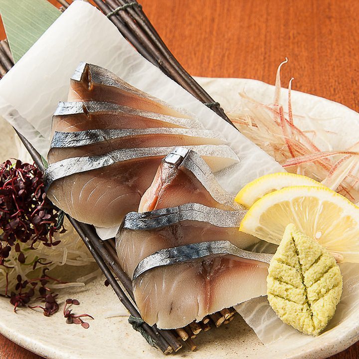 Raw Japanese mackerel soaked in vinegar and served cut into thin slices.